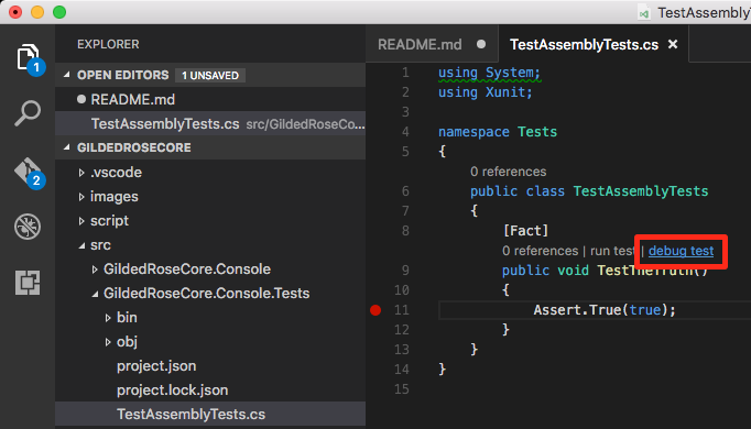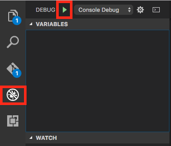 The workspace comes preconfigured to debug the console application in VSCode. Simply, click the debug icon and then the play icon.