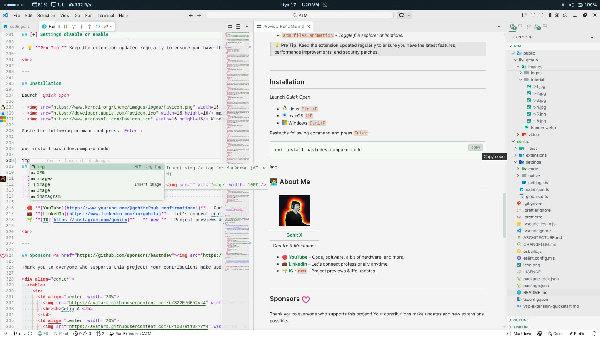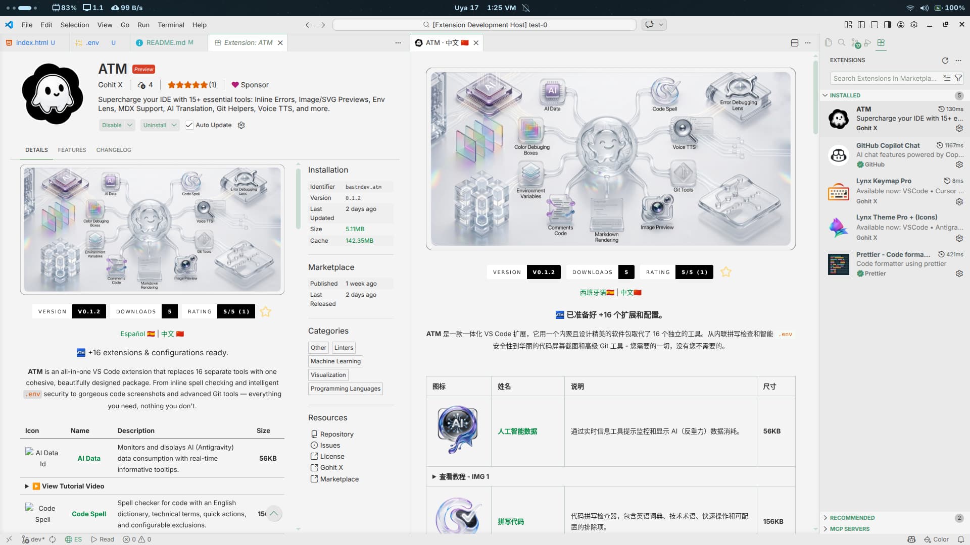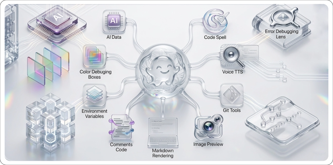 ATM is an all-in-one VS Code extension that replaces 16 separate tools with one cohesive, beautifully designed package. From inline spell checking and intelligent .env security to gorgeous code screenshots and advanced Git tools β everything you need, nothing you don't.