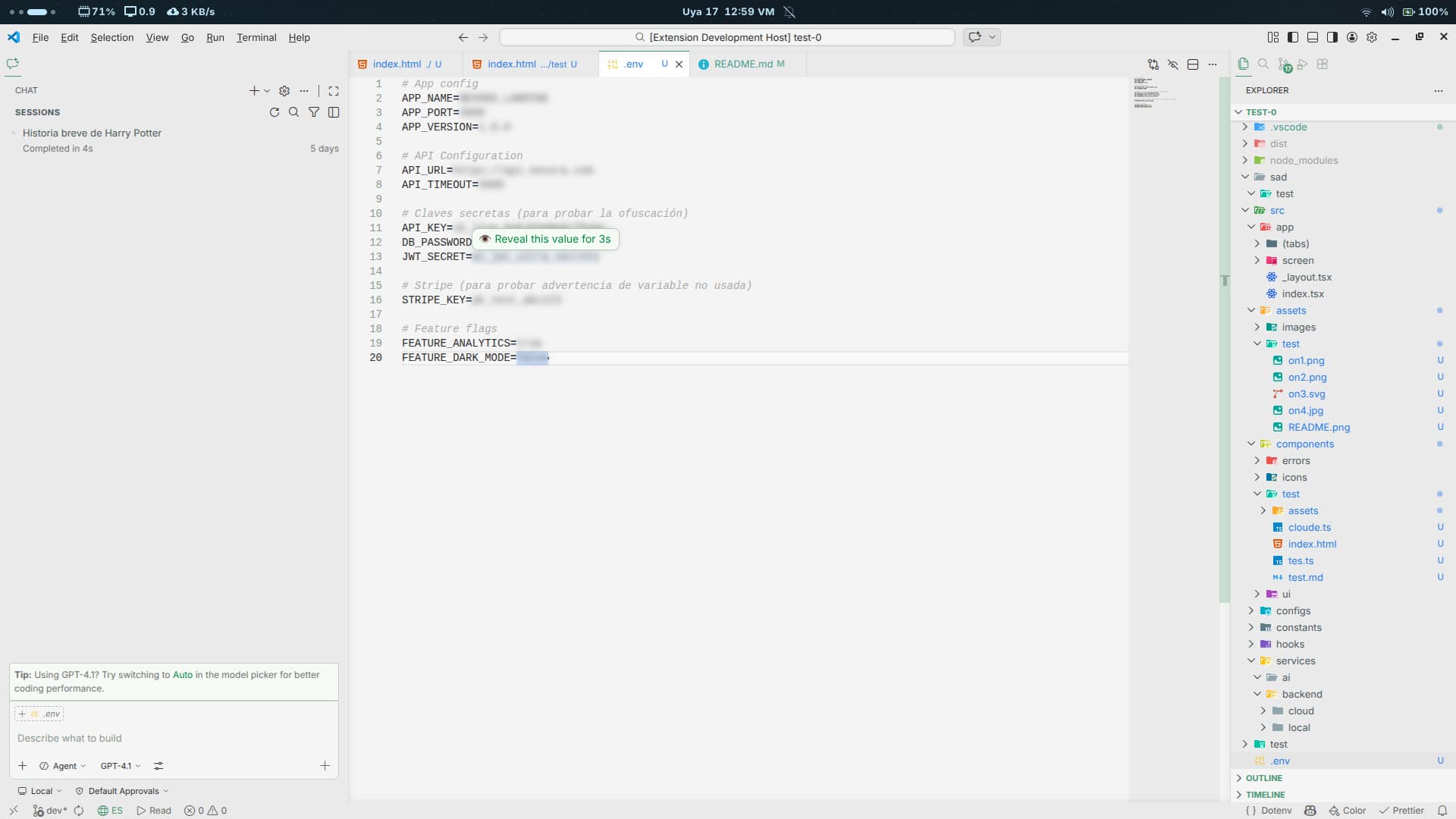 Env Lens | Parses .env files securely and hides values with BLUR (hide/show temporarily) using decorators and hover interactions. |